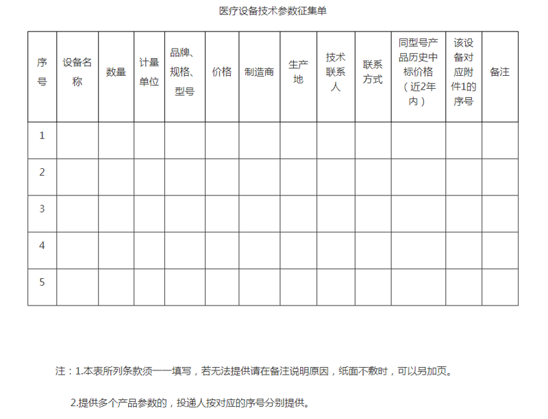1)医疗设备技术参数征集单(详见附件2),加盖公章;